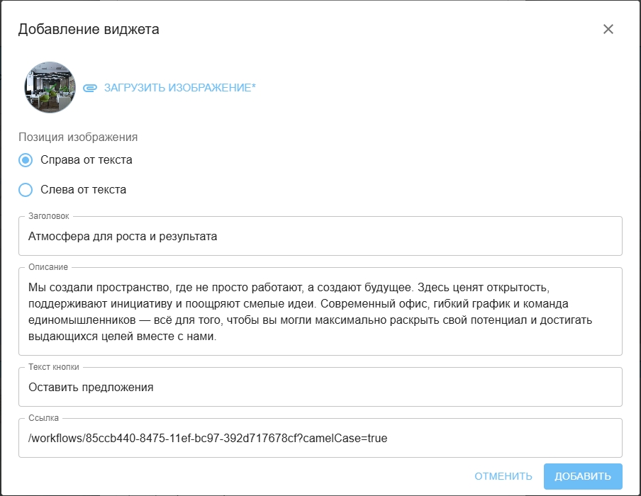 - Кнопка и Ссылка – если необходимо настроить переход по кнопке (на внутреннюю страницу/внешний ресурс), то задается название для данной кнопки и ссылка, по которой будет происходить переход