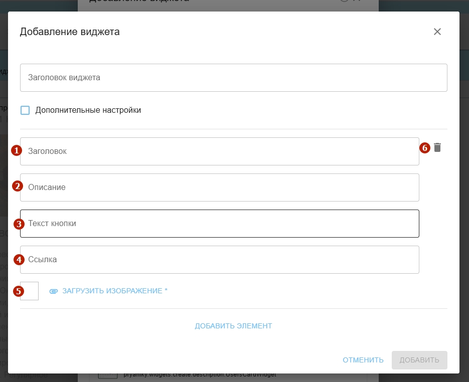 - По кнопке “Добавить элемент” – отображаются настройки для конкретной карточки, которая будет выводиться в виджет. Данных элементов может быть несколько. Настройки для каждого элемента: