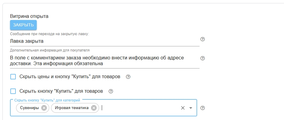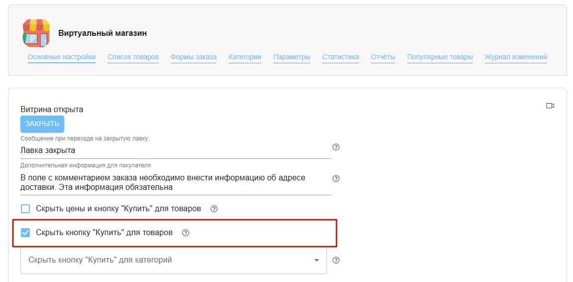 1. Скрытие кнопки “Купить” для всех товаров виртуальной лавки. Для этого необходимо установить флаг “Скрыть кнопку “Купить” для товаров”