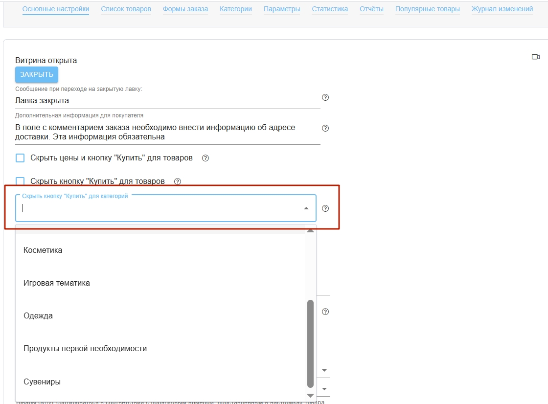 2. Скрытие кнопки “Купить” для товаров определенной категории. Для этого необходимо в поле с выбором категорий выбрать те категории, для которых необходимо скрыть кнопку “Купить”