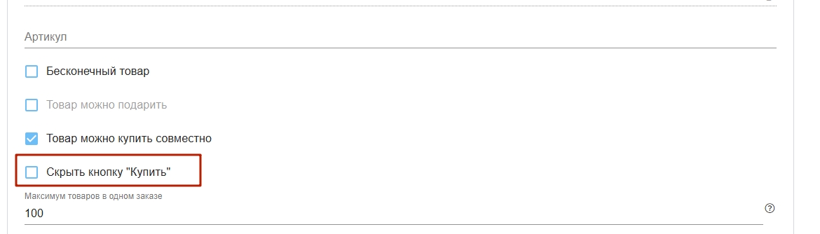 3. Скрытие кнопки “Купить” для конкретного товара. Для этого необходимо пейти в настройки конкретного товара и установить флаг “Скрыть кнопку “Купить””