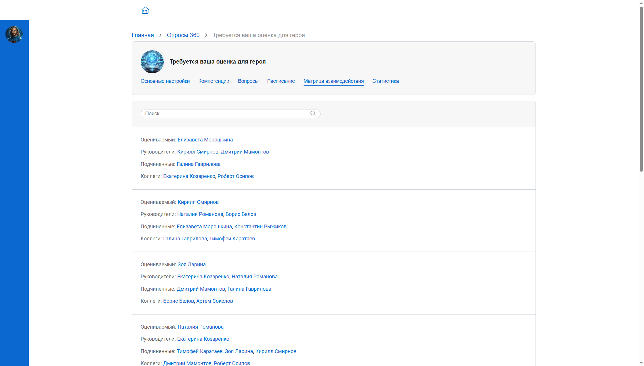 Матрица взаимодействия формируется на основе данных из оргструктуры, а также может учитывать взаимодействие сотрудников разных департаментов во внутренней соцсети. После автоматического формирования матрицы возможно ее ручное редактирование.