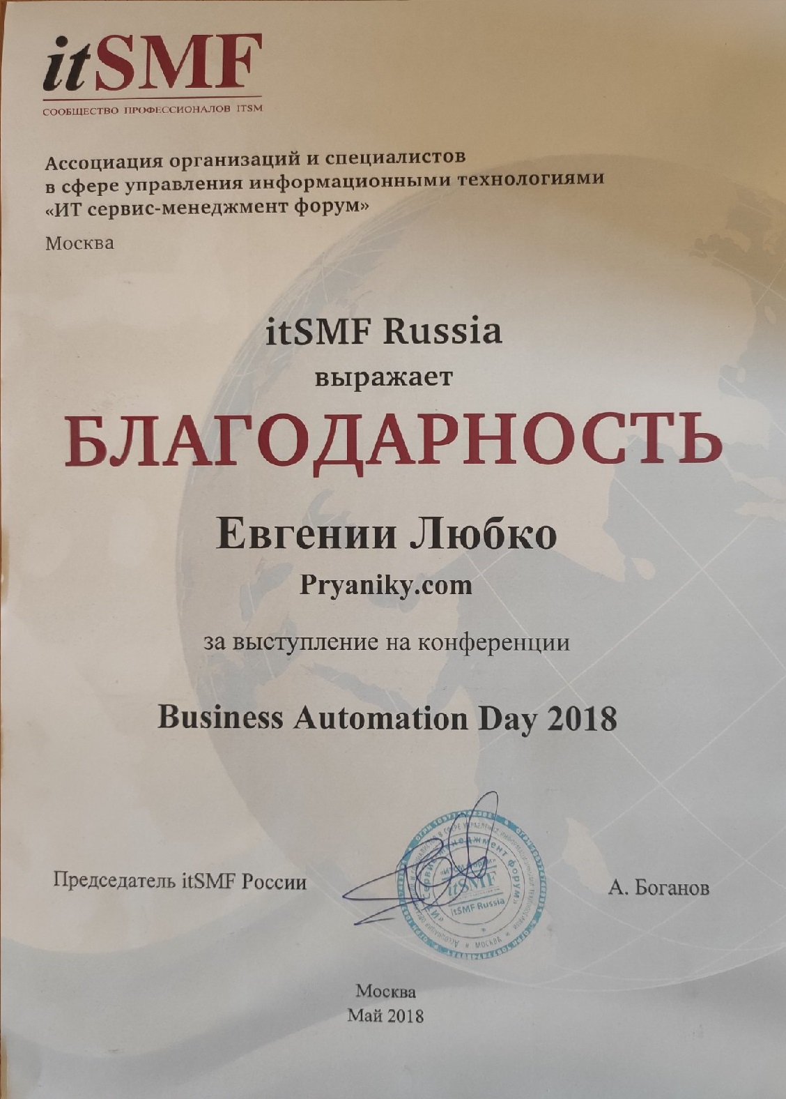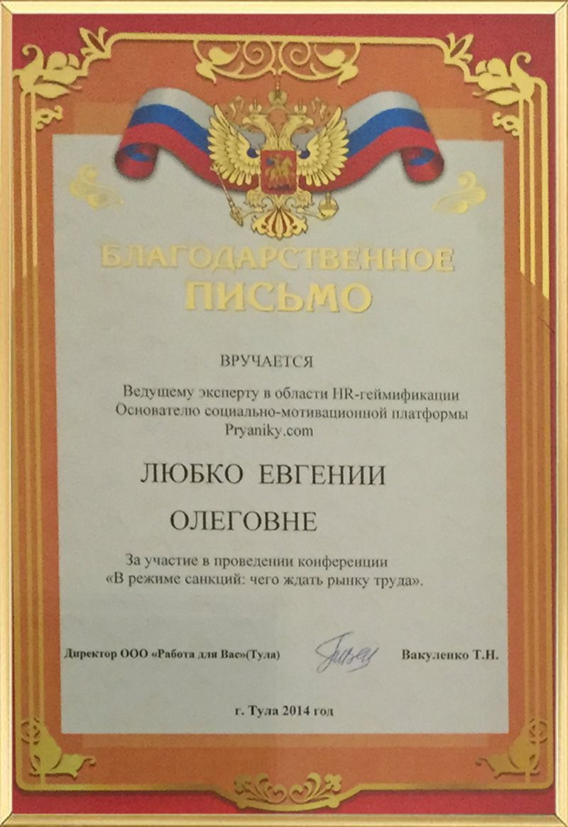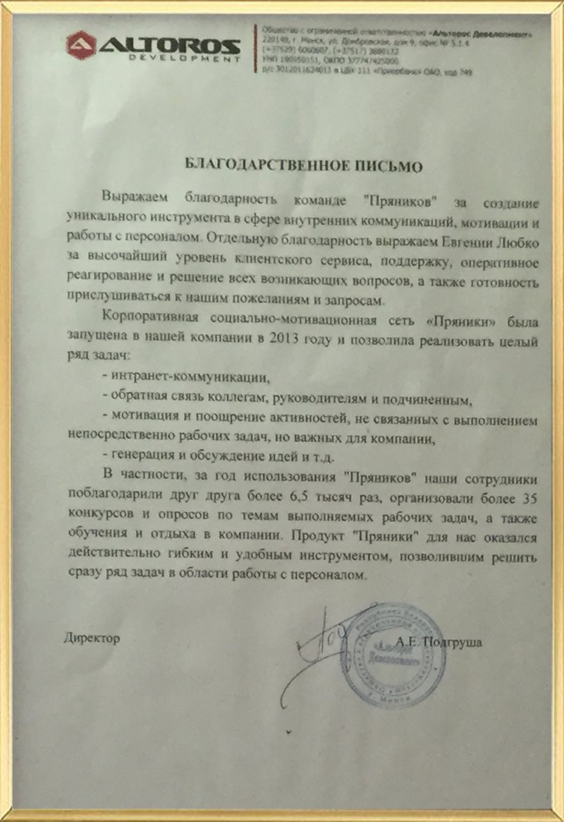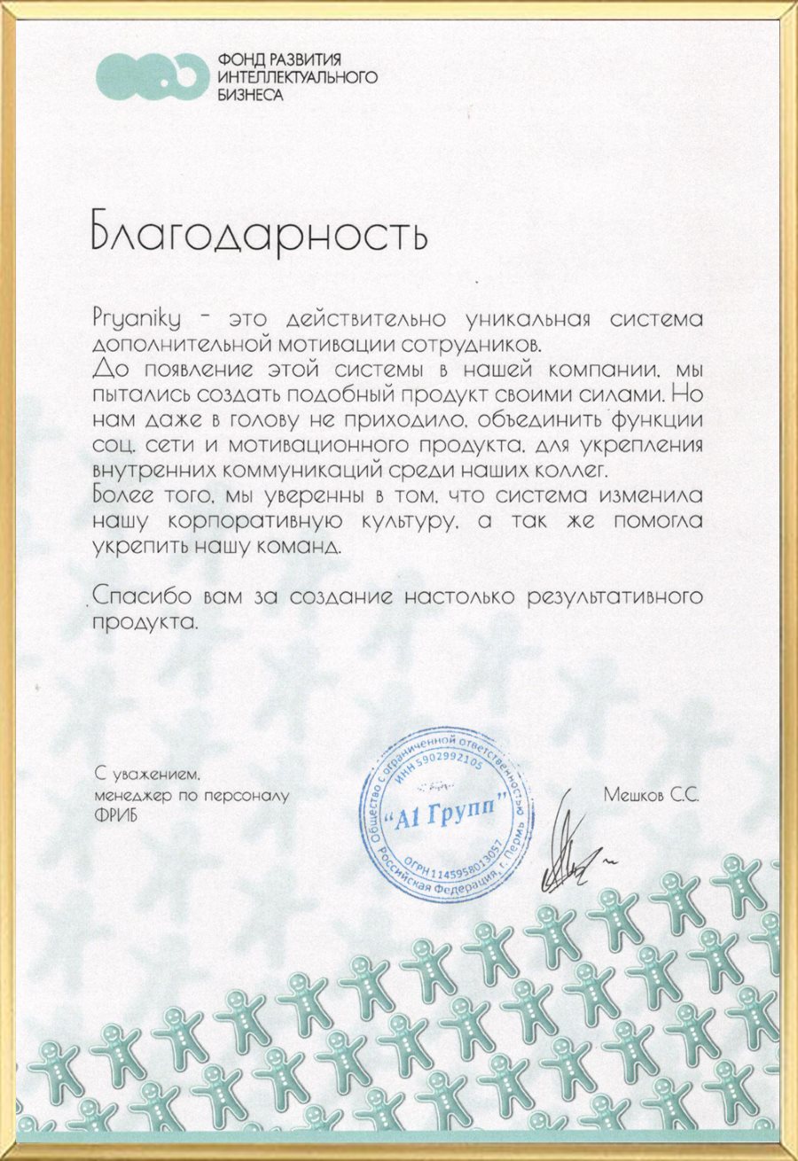 Благодарственное письмо от компании «Фонд Развития Интеллектуального бизнеса».