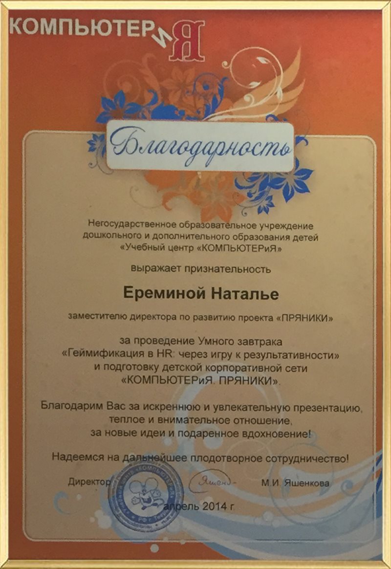 Благодарность за проведение бизнес-завтрака от компании «КомпьютериЯ».